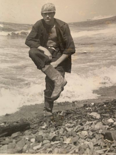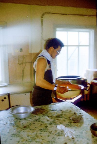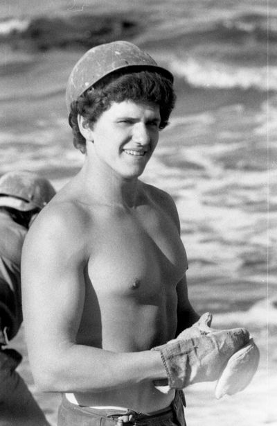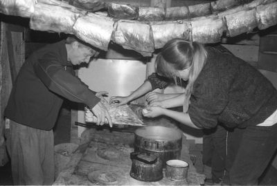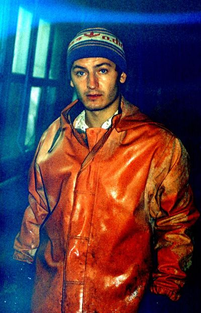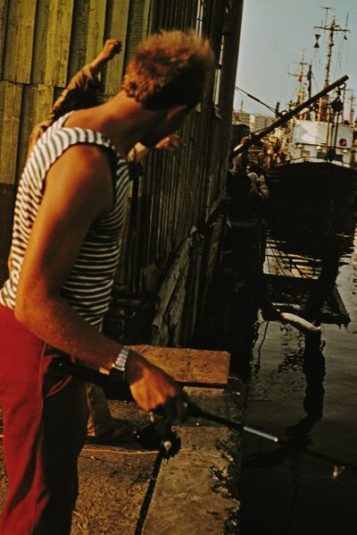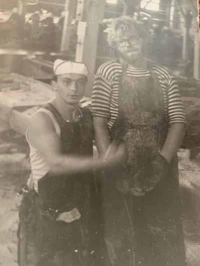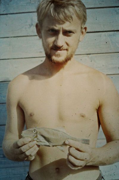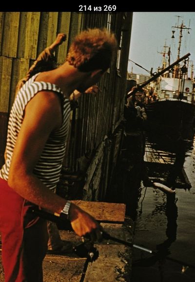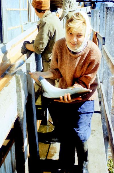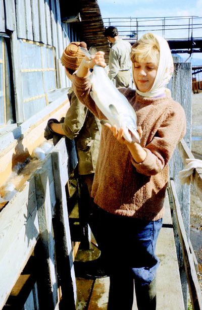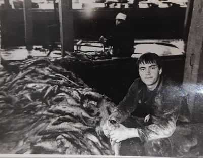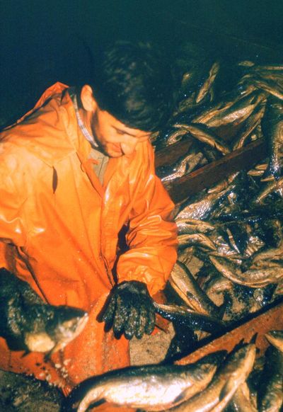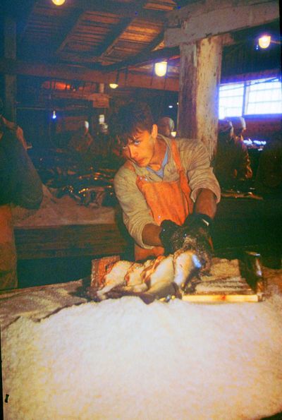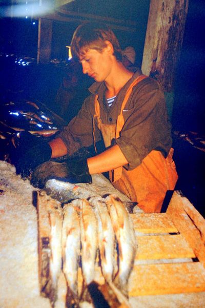 Яша Коренев выбивает из рыбы соль.