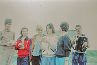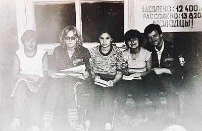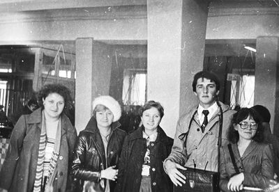 Вечером после работы (слева направо) Маценко Наташа, Грачева Лена, Гутова Марина, Козлова Наташа, Самуйлов Саша