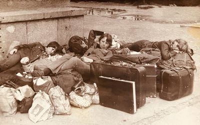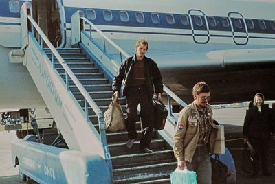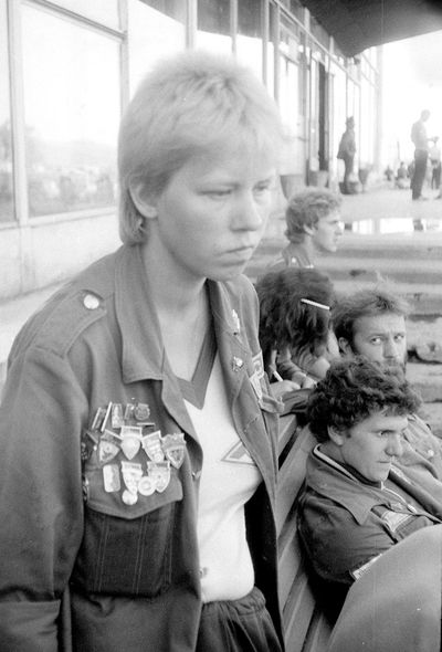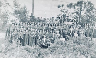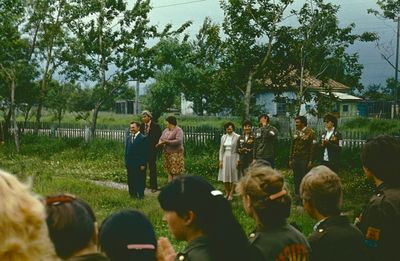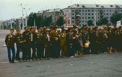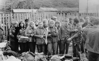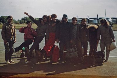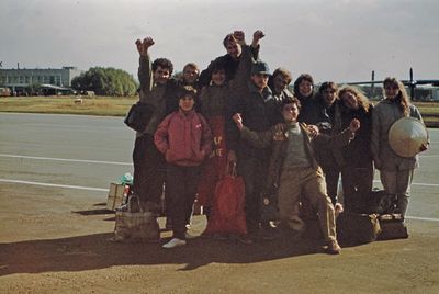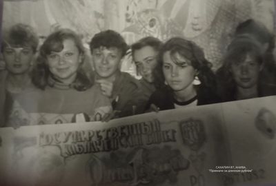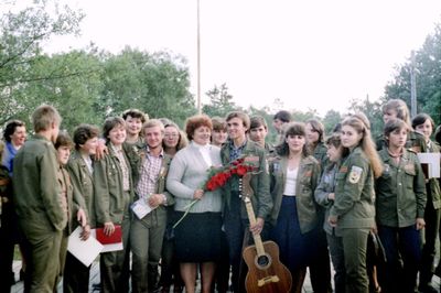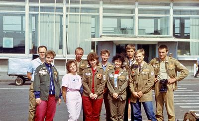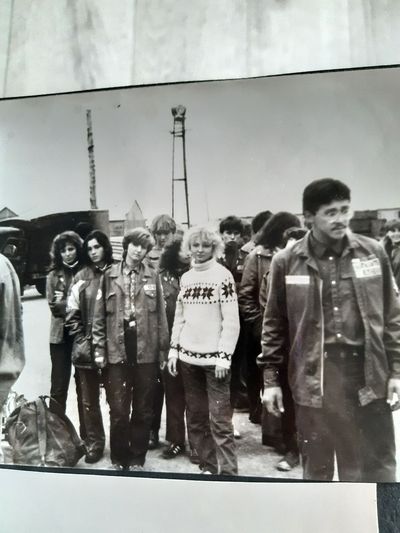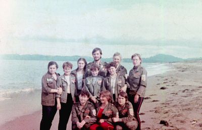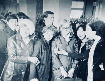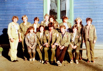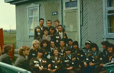 Отъезд домой. Южно-Сахалинск слева направо сидят : Вагнер Лариса, Качаева Таня, Сидоренко Оля, Больных Оля, Осинцева Лена, Щёткина Галя, Зятьков Саша стоят : Жигадло Алексей, Хабидулина Марина, Сургутскова Галя, Ерёмина Ира, Лапшина Ира, Браже Валя, Макушкина Наташа, Молчанова Таня