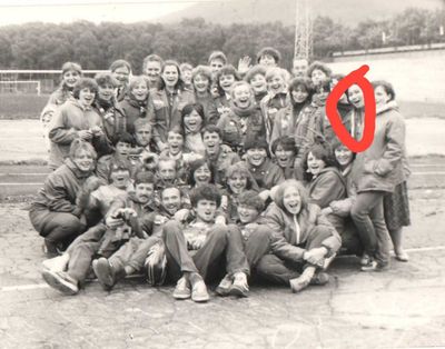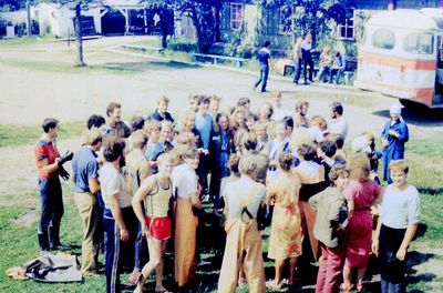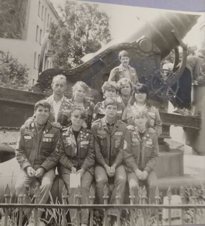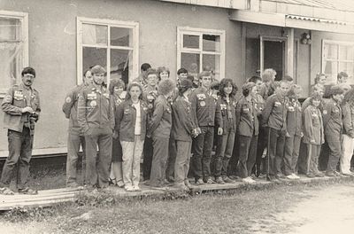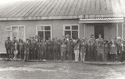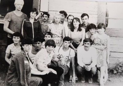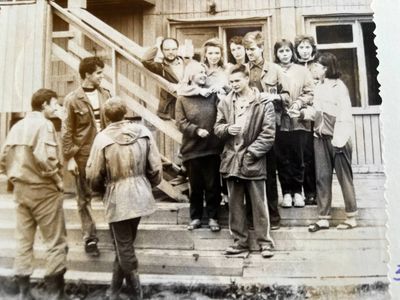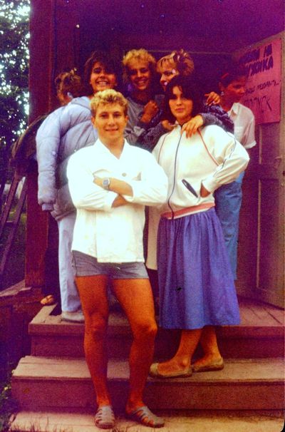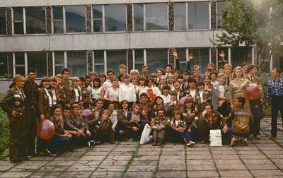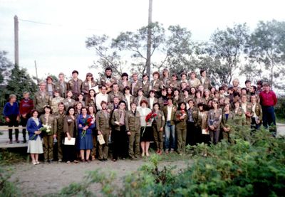 Экскурсия ПИОНЕРОВ по местам былой славы. У корпуса в Рейдово, где располагался отряд АВАНТЕ в 1988 году. Стоят - Данильцева Катя - Жованник (Чащина) Лена - Чащин Саша - Тригубова Оксана - Усова (Оларь) Ольга - Оларь Саша - Тригубова Таня Сидят - Кузнецов Боря - Шульгин Вадим - Нельга (Григорьева) Галя