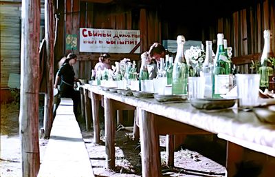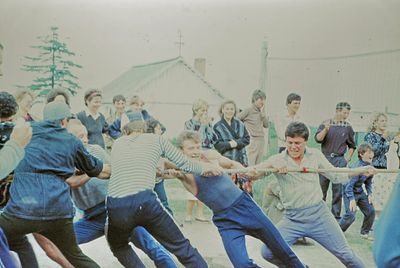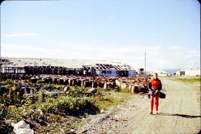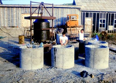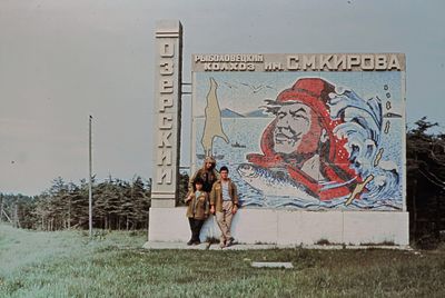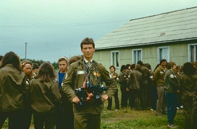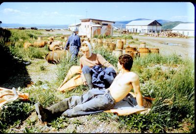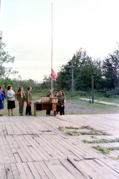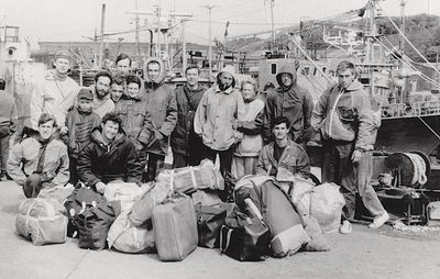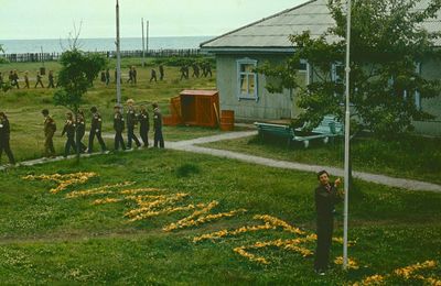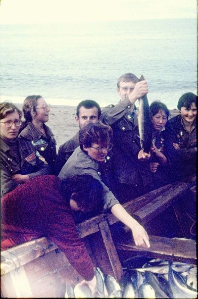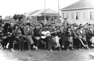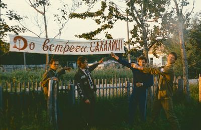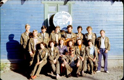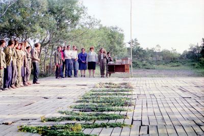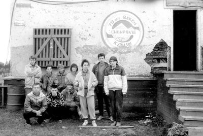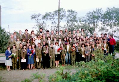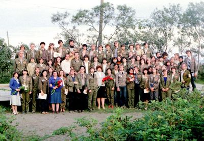 У рыбцеха в п.Пионер, Итуруп Верхний ряд - кто-то местный - ещё один - Андрей Овсяников - местная барышня - Оля Усова - за ней Саня Чащин - Вова Соколов (в галстуке по центру) - Галя Нельга (Григорьева) - за ней Саша Оларь - Катюха Данильцева - за ней Влад Шульгин - Влад Ширяев (тоже в галстуке) - и Иван Иванович Милюкин Нижний ряд - Костя К - Жованник Лена - Оксана Тригубова - Андрей Момзиков с ведром браги и рюмками - Таня Тригубова