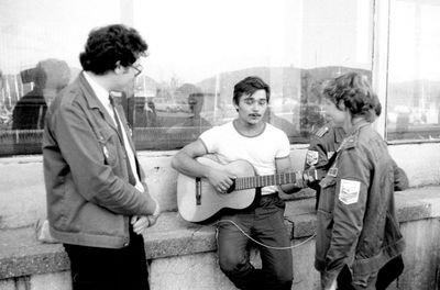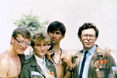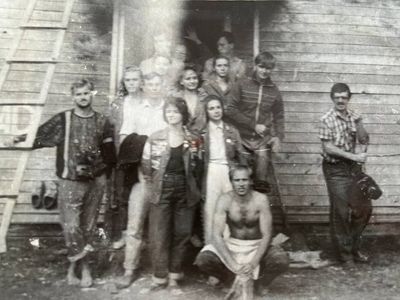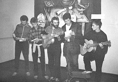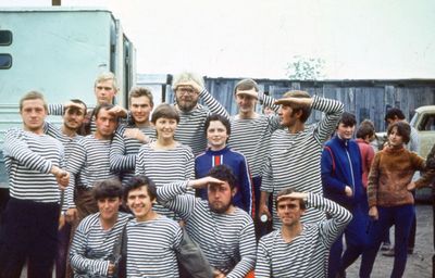 Агитбригада Аванте 81 Первый ряд Дмитриенко Игорь Арумс Слава За ними Сакович Степа в полосатой рубашке Слева ? Наверху Калевинский Владимир