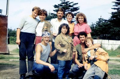 Приезд Аванте-Т на о. Итуруп (1992 г). Рыжов Юрий, Машанов Андрей, Пелах Дмитрий и Пелах Саша, Занин Вова, ниже Топоровский Виталий, Иващенко Тина, вверху Салов Дима, Панов Юрий, Пляскин Юрий, Фирсанов Костя, Овсянкина Майя, Кондратенко Костя, Романовский Борис. снизу Винник Саша.